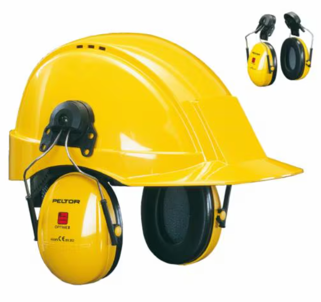 *- 3M Peltor helmet-attached earmuffs are designed for integration with industrial safety helmets, providing high-performance hearing protection in noisy environments. These, often referred to as P3E or similar model, attach directly to the hard hat slots, offering versatility for tasks requiring both head and hearing protection.