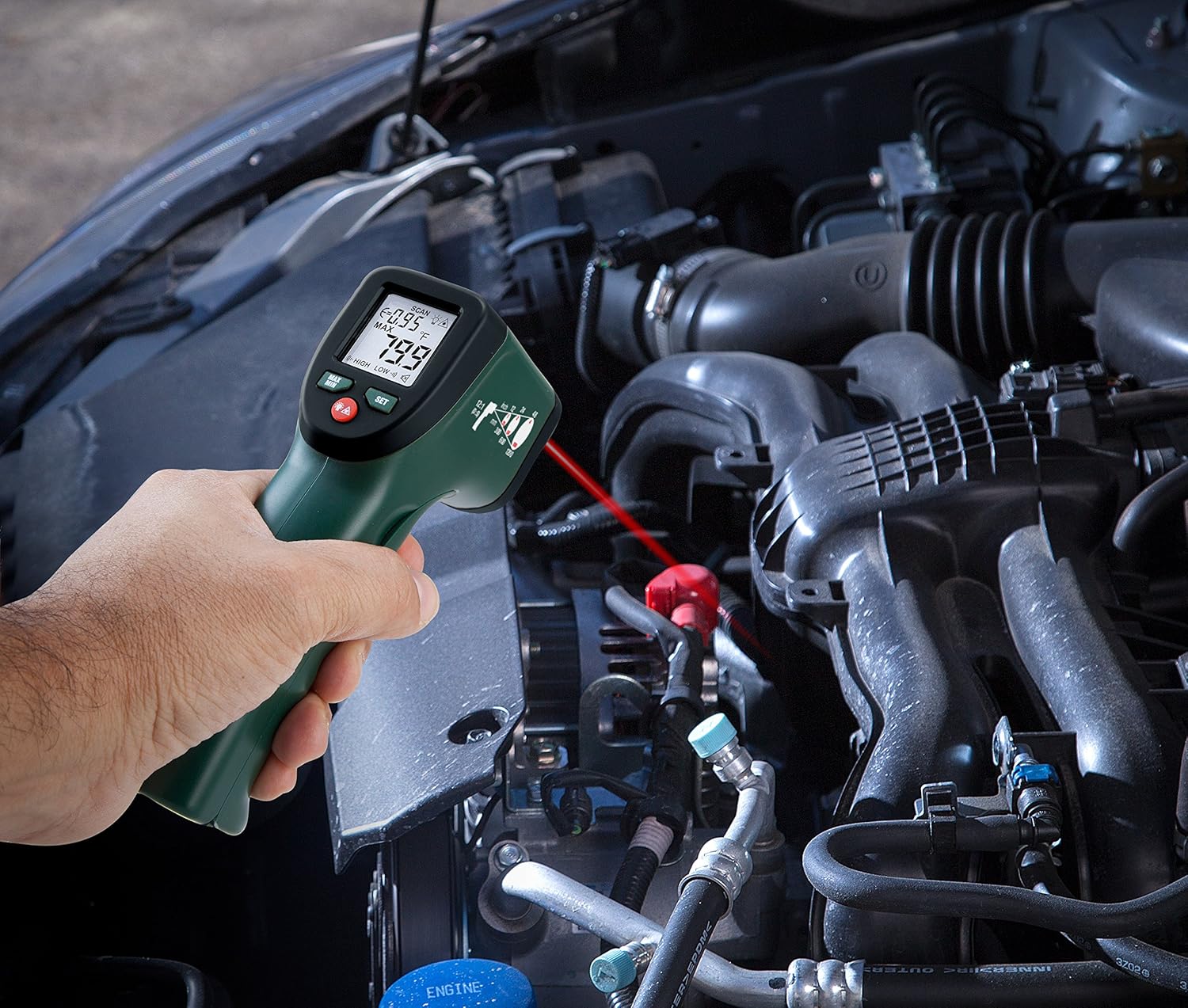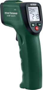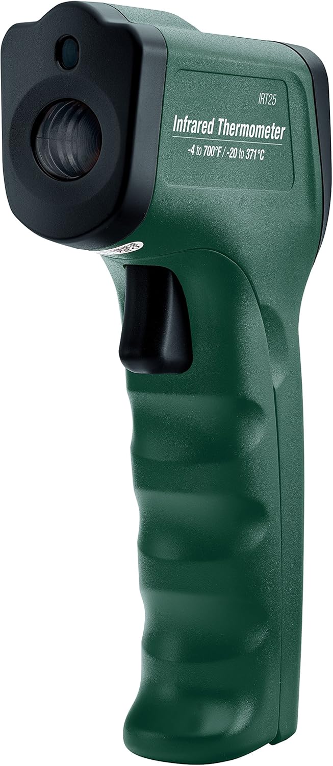 - The Extech IRT25 has a temperature measurement range of -4° to 700°F, and a 12:1 distance to spot size ratio. Additional features include a built-in laser pointer, programable high/low alarm alerts, and a white-backlit LCD display. There’s also a max/min data hold memory.